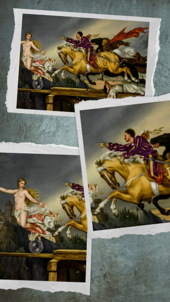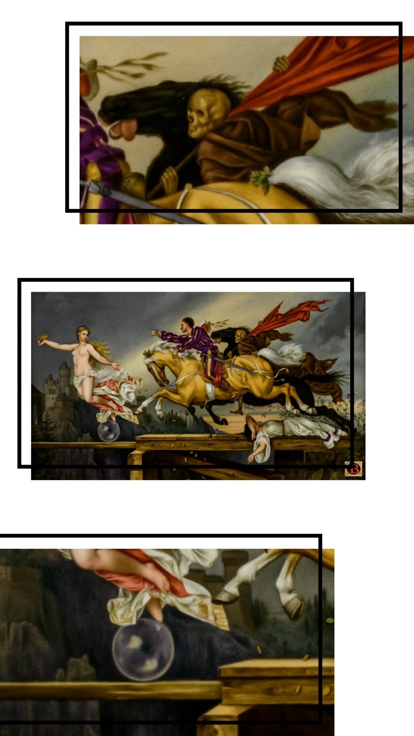 In basso, distesa, c’è una donna che il cavallo, nella sua corsa, sta calpestando: questo rappresenta la poca attenzione nella ricerca della bellezza, la mancanza di riguardo verso le altre persone e lo scarso interesse per i danni che si possono infliggere.