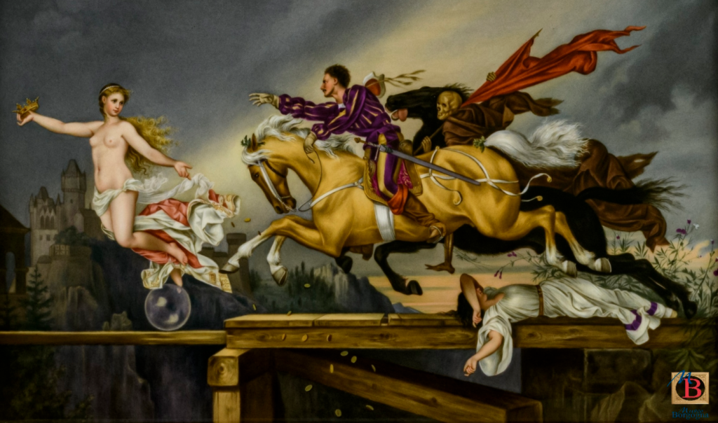 Vorrei descrivere le mie impressioni su un quadro esposto, La caccia sfrenata della felicità, un’opera della seconda metà del XIX secolo (https://www.museoborgogna.it/opere/manifattura-reale-di-berlino-copia-su-porcellana-da-henneberg/).