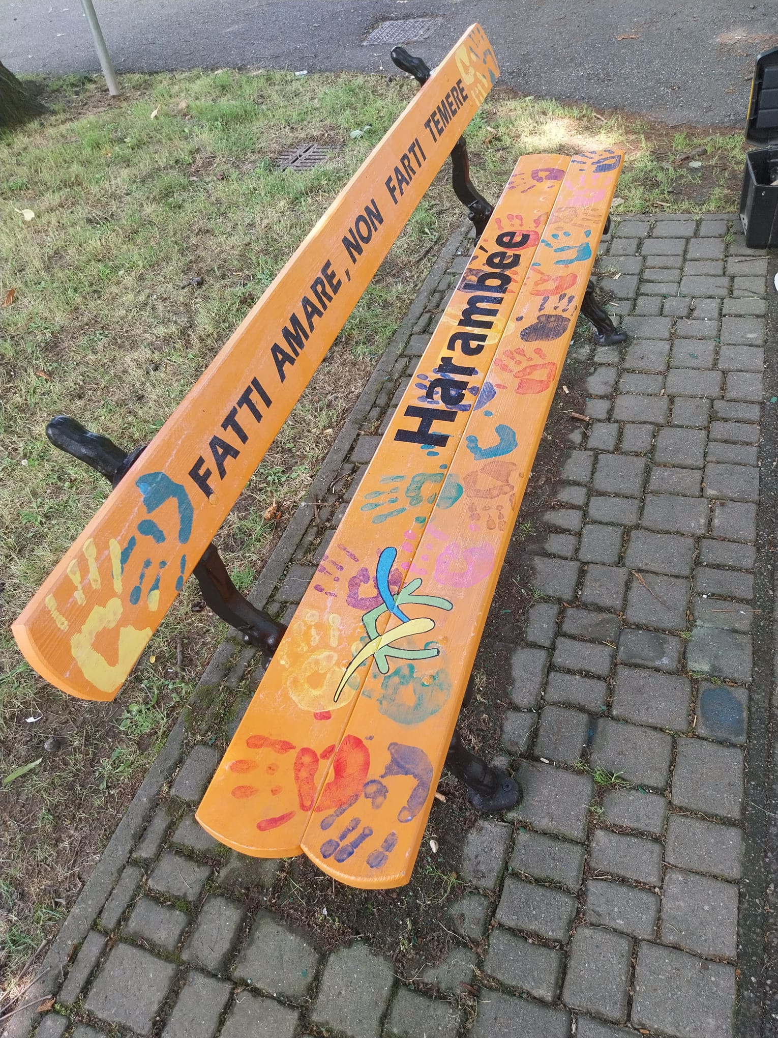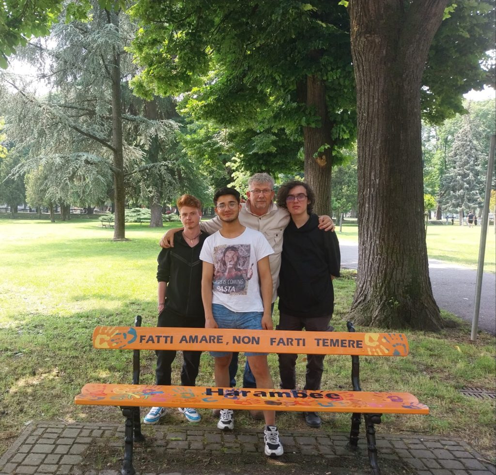 Alcuni ragazzi di Harambée hanno accolto la proposta di partecipare e hanno collaborato alla realizzazione della panchina. Il disegno è opera di Muslum, un ragazzo del GApp; alla realizzazione, oltre a lui, hanno lavorato Lorenzo e Sergej, guidati e coadiuvati da Roberto Paparella. Questo lavoro è parte del laboratorio HARAMBEhEArt, che vede coinvolti ragazze e ragazzi nella realizzazione di lavori in legno e non solo.
