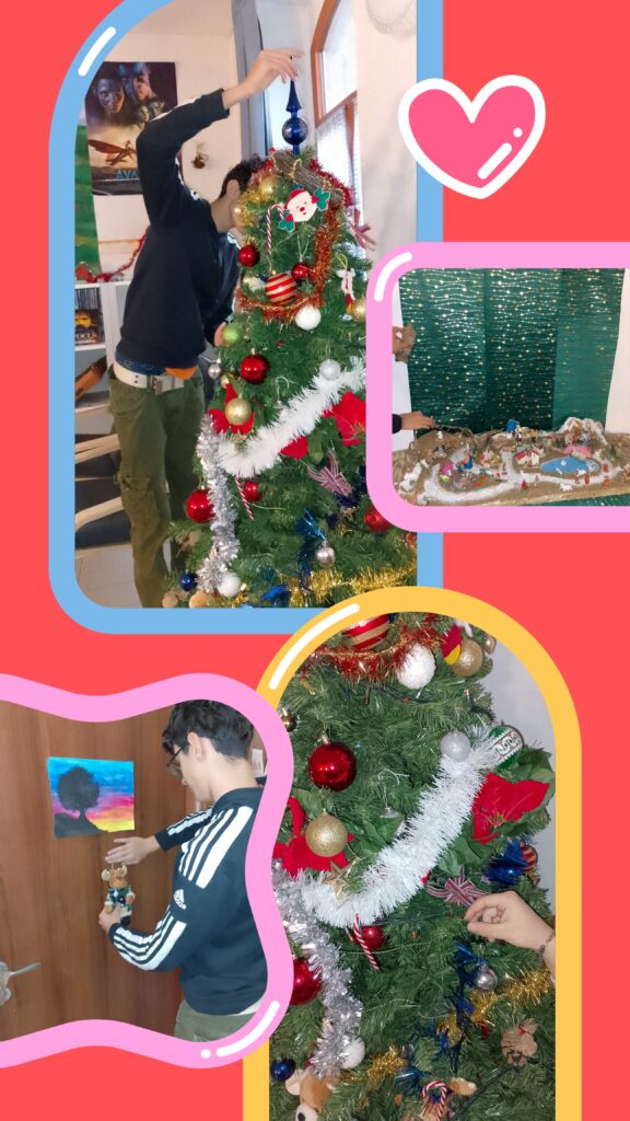 Intanto, fatto il presepe e l’albero, si completano gli addobbi in giro per la casa: nel tran tran quotidiano si percepisce una sorta di desiderio di calore domestico, una voglia di ricreare un ambiente familiare, al riparo dal freddo che è fuori dalla finestra, al riparo dal dolore e dalla sofferenza, che non sono mancati né possono mancare nella vita di questi giovani e giovanissimi, ma che possono essere mitigati dal caldo abbraccio di qualcuno che – anche senza parole – riesce a dire “Sono qui con te, sono qui per te!”