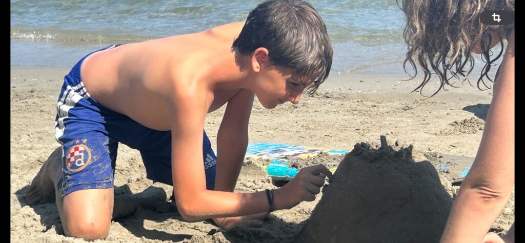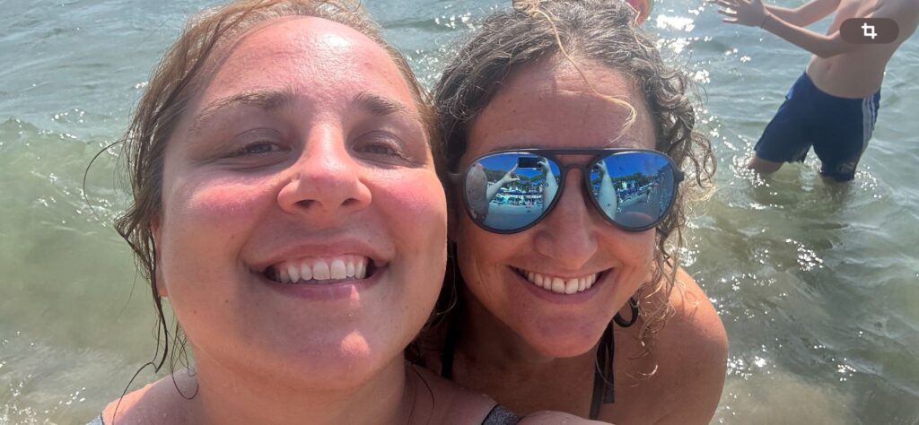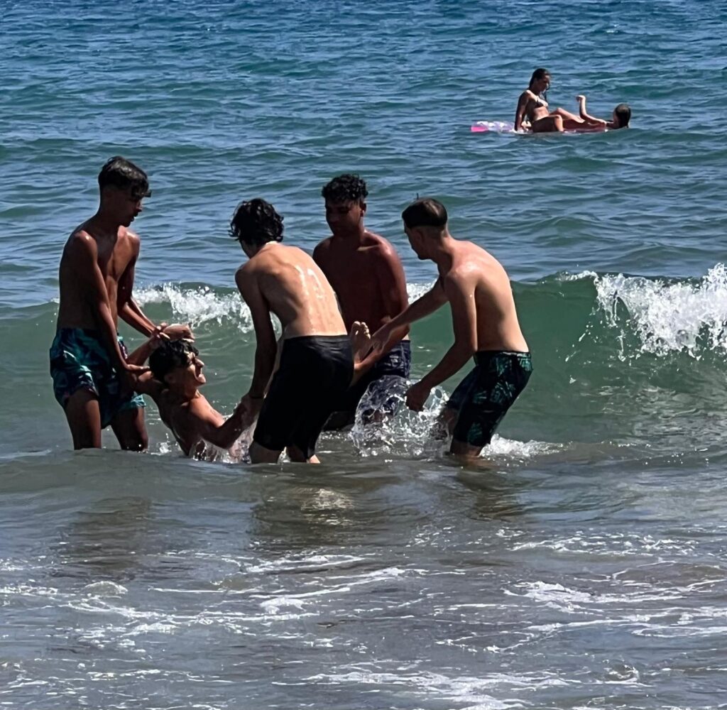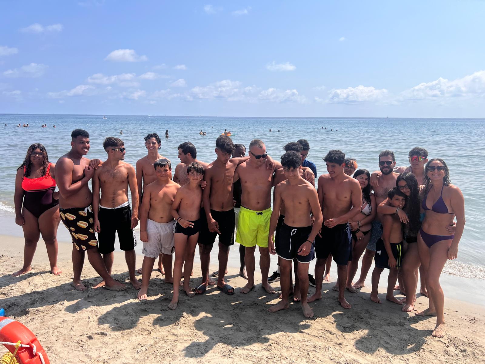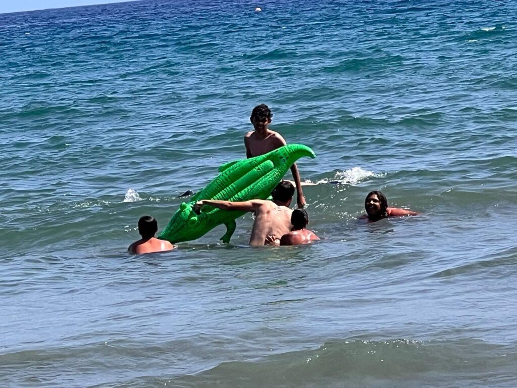 Primo giorno di mare, le educatrici pronte a spalmare crema solare come marmellata sul pane, poi tutti in acqua. Che meraviglia!