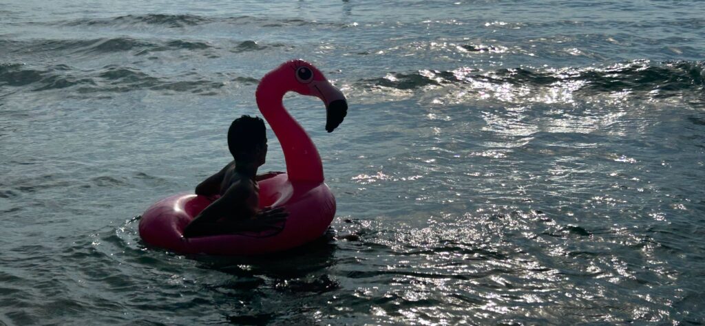 I ragazzi sono di nuovo in acqua, si inseguono, si tuffano, si contendono il coccodrillo gonfiabile verde prato come fosse un trofeo. Poco più in là qualcuno si fa cullare dalle onde, morbidamente adagiato su una magnifica fenicottera rosa shocking. Sembra quasi che il coccodrillo subisca le angherie dei ragazzi e la fenicottera se la goda alla grande. Mah? Sarà solo immaginazione…