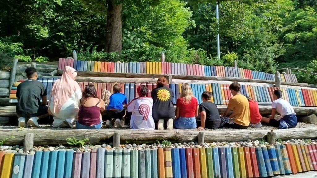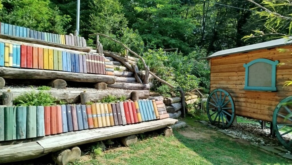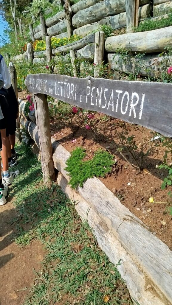 Il “Giardino dei pensatori” è una zona pensata per il relax, con gradinate e spazi in cui accomodarsi, vicino c’è una carrozza che contiene una piccola biblioteca.