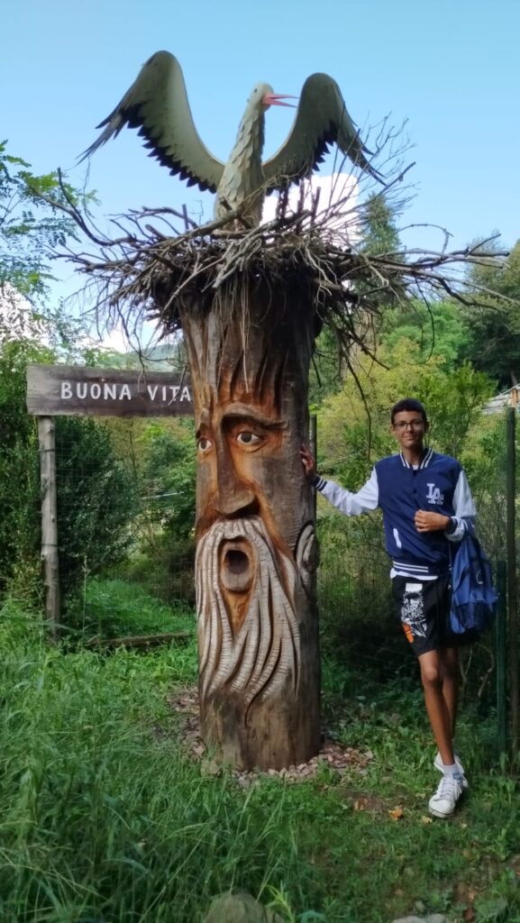 C’è un Totem all’ingresso, ricavato da un castagno molto grande e importante, che è caduto. Era un peccato farne contenitore per i terrazzamenti, così eccolo trasformato in un’opera d’arte!